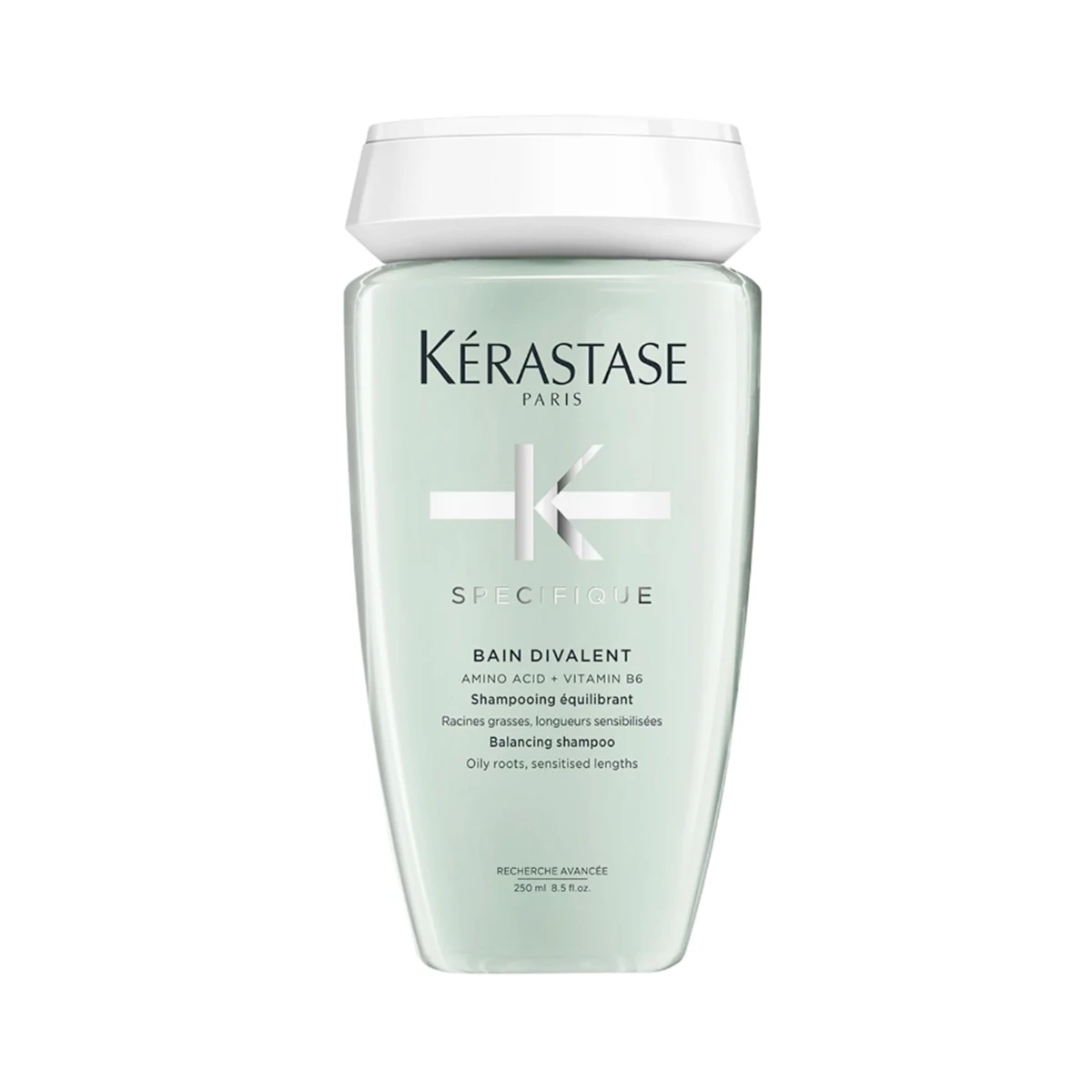 - KERASTASE – DivalentCe shampoing crème est enrichi en acide aminé et vitamine B6 pour les cuirs chevelus gras et longueurs sensibilisées. Il nettoie délicatement les cheveux en éliminant les impuretés et excès de sébum tout en respectant les longueurs afin de limiter leur desséchement.