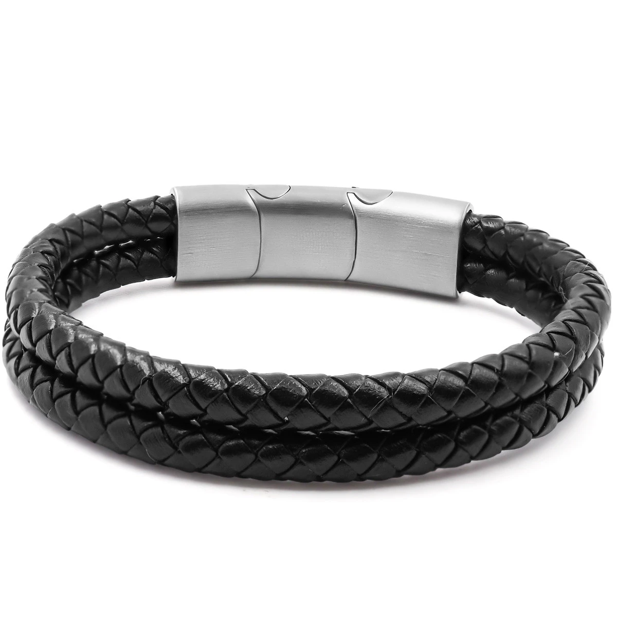 Bracelet acier pour homme – simili cuir tressé noir – 2 rangs – 19,5+1,5cm