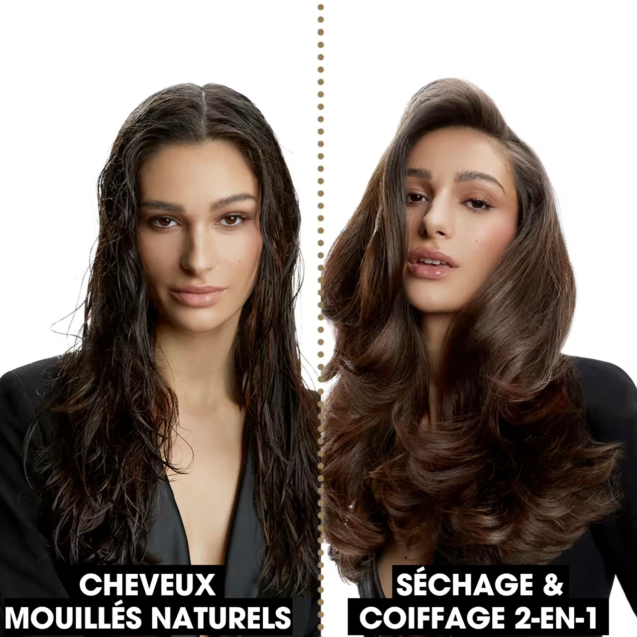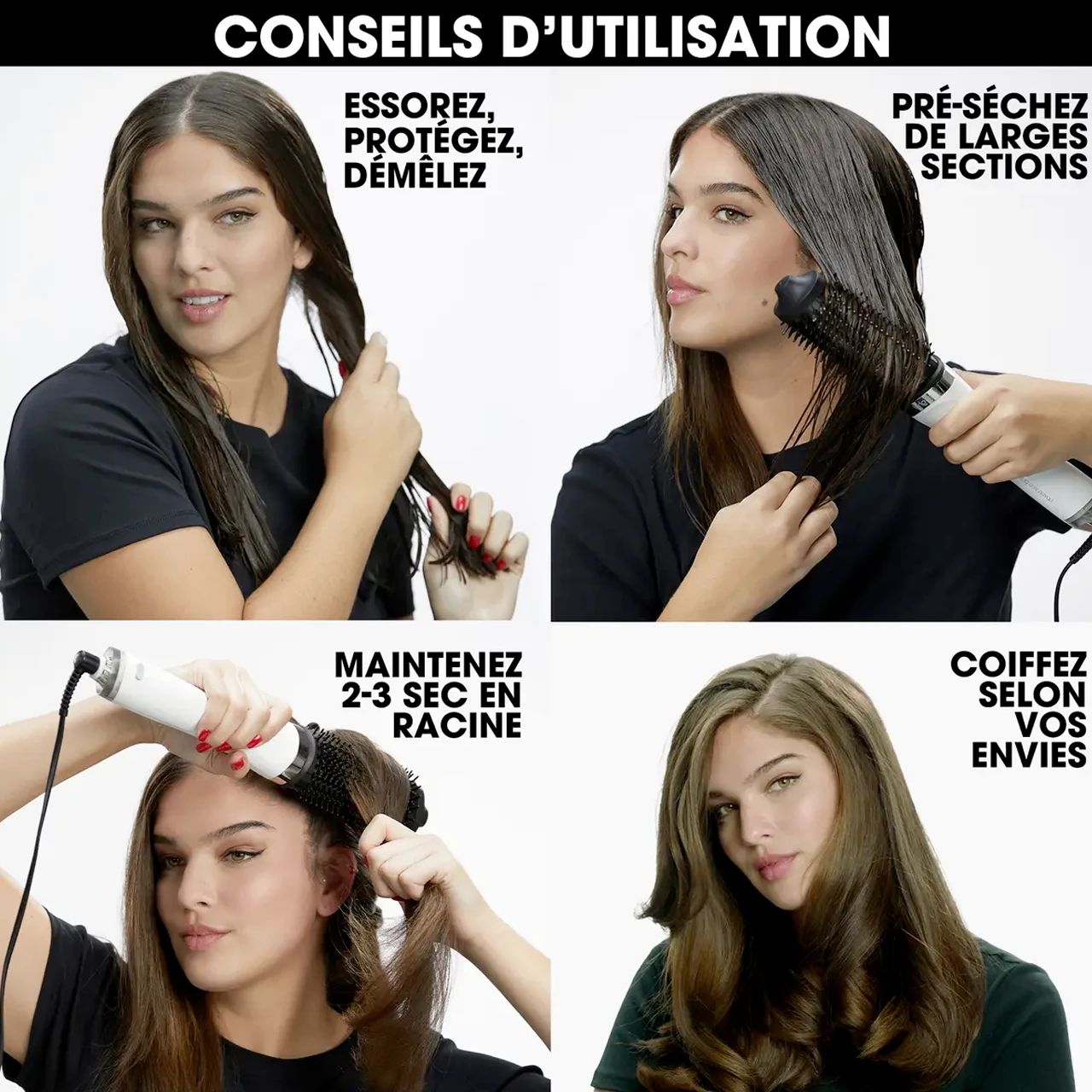 – La brosse soufflante 2-en-1 diffuse une température de coiffage optimale basse de 120°C sur le corps et les picots chauffants.