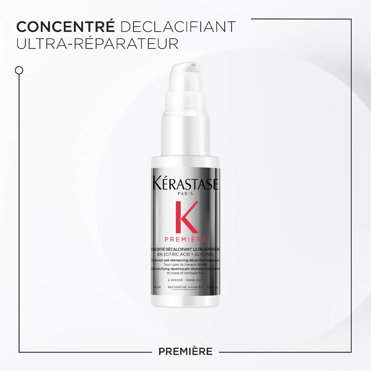 Concentré Ultra-Réparateur Décalcifiant Première Kérastase 45ml: Le Concentré Décalcifiant Ultra-Réparateur est un traitement pré-shampoing concentré en acides purs à double-action décalcifiante et ultra-réparatrice pour tous les cheveux abîmés. Il élimine l’overdose de calcium responsable de la casse à la surface et à l’intérieur du cheveu et reconstruit les ponts internes de la fibre.