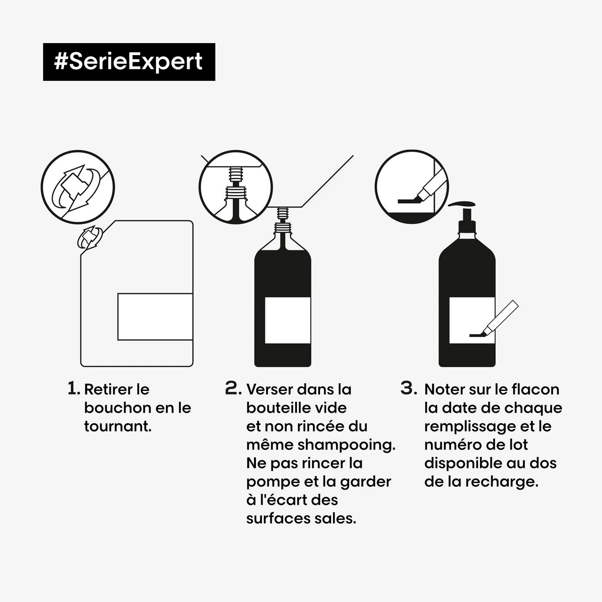 – Verser dans la bouteille vide et non rincée du même shampoing. Ne pas rincer la pompe et la garder à l’écart des surfaces sales.