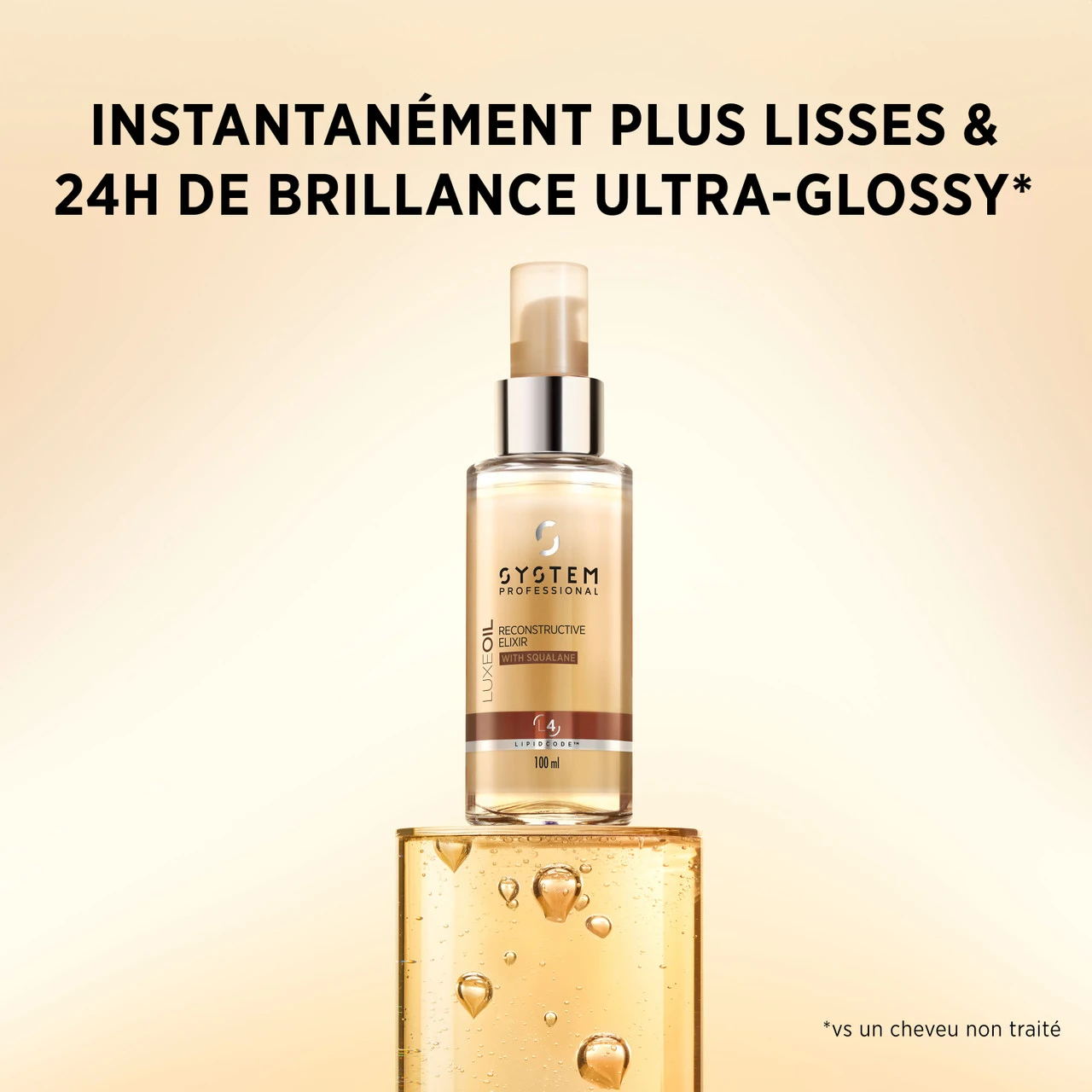 - SYSTEM PROFESSIONAL – Tous types de cheveuxTransformez et réparez instantanément les cheveux de l’intérieur avec Luxe Oil Reconstructive Elixir de System Professional. Cette huile d’exception à la kératine protège les cheveux contre le dessèchement et procure une douceur longue durée. Le Luxe Oil Reconstructive Elixir donne instantanément aux cheveux douceur et haute brillance.