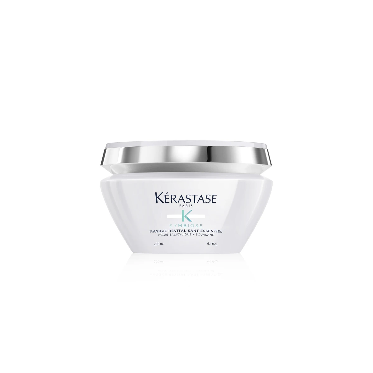 - KERASTASE – SYMBIOSELe Masque Revitalisant Essentiel Symbiose de Kérastase est destiné aux cheveux abîmés et aux cuirs chevelus à tendance pelliculaire. Son action ultra-revitalisante permet de réparer la fibre capillaire abîmée. Le masque contribue à éliminer les résidus de pellicules restants au sein des longueurs avec sa forte propriété démêlante qui facilite le coiffage. Les cheveux sont 97% plus hydratés. La fibre est intensément plus douce et 2x plus brillante Le masque agit comme un bouclier anti-humidité et les frisottis sont réduits de -42%. Son parfum iconique fera de son application un véritable moment de bien-être.Sa formule unique est enrichie en Acide Salicylique et en Squalane. L’acide Salicylique est un actif puissant qui élimine les pellicules présentes sur votre cuir chevelu. Le Squalane protège la fibre et hydrate les cheveux en douceur.