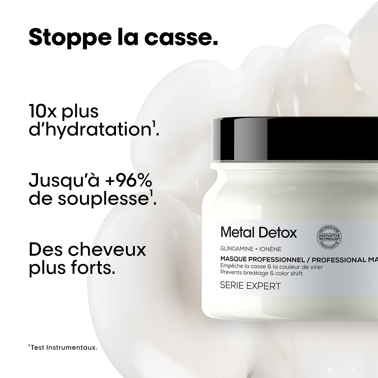 Protocole Metal detoxINGRÉDIENTS :INGREDIENTS: AQUA / WATER / EAU CETEARYL ALCOHOL AMODIMETHICONE BEHENTRIMONIUM CHLORIDE CETYL ESTERS PARFUM / FRAGRANCE ISOPROPYL ALCOHOL TRIDECETH-6 PHENOXYETHANOL LIMONENE CETRIMONIUM CHLORIDE HEXYL CINNAMAL LINALOOL CHLORHEXIDINE DIHYDROCHLORIDE CITRAL GERANIOL GLYCINE TOCOPHEROL POLYQUATERNIUM-7 SODIUM BENZOATE (F.I.L. C263113/1).Les listes d’ingrédients entrant dans la composition des produits sont régulièrement mis à jour. Avant d’utiliser un produit de la marque, veuillez lire la liste d’ingrédients située sur son emballage afin de vous assurer que les ingrédients sont adaptés à votre utilisation personnelle. - la gamme metal detoxLa garantie professionnelle pour vos colorations, balayages et décolorations.Le 1er protocole2 qui neutralise et détoxifie les cheveux du métal.-87%3 de casse.2 Résultat couleur 100% optimisé.4Compatible avec toutes les marques de coloration ou décoloration.[Le métal est présent au cœur de la fibre.]Lors des colorations, décolorations et balayages, la présence de métal en excès peut entraîner la casse et une irrégularité du résultat coloriel.Sa technologie : Glicoamine :Grâce à sa petite taille, cet agent de chélation est capable de pénétrer au sein de la fibre pour neutraliser et détoxifier les cheveux du métal.Le protocole Metal Detox :1°) Neutralisateur anti-métalPRÉ-TRAITEMENT PROFESSIONNELNeutralise le métal avant les services techniques de coloration, balayage ou décoloration.2°) Crème lavante anti-métalSHAMPOOING PROFESSIONNELDétoxifie le cheveu du métal après un service technique.3°) Protecteur anti-dépôtMASQUE PROFESSIONNELProtège la fibre du dépôt de particules de métal.