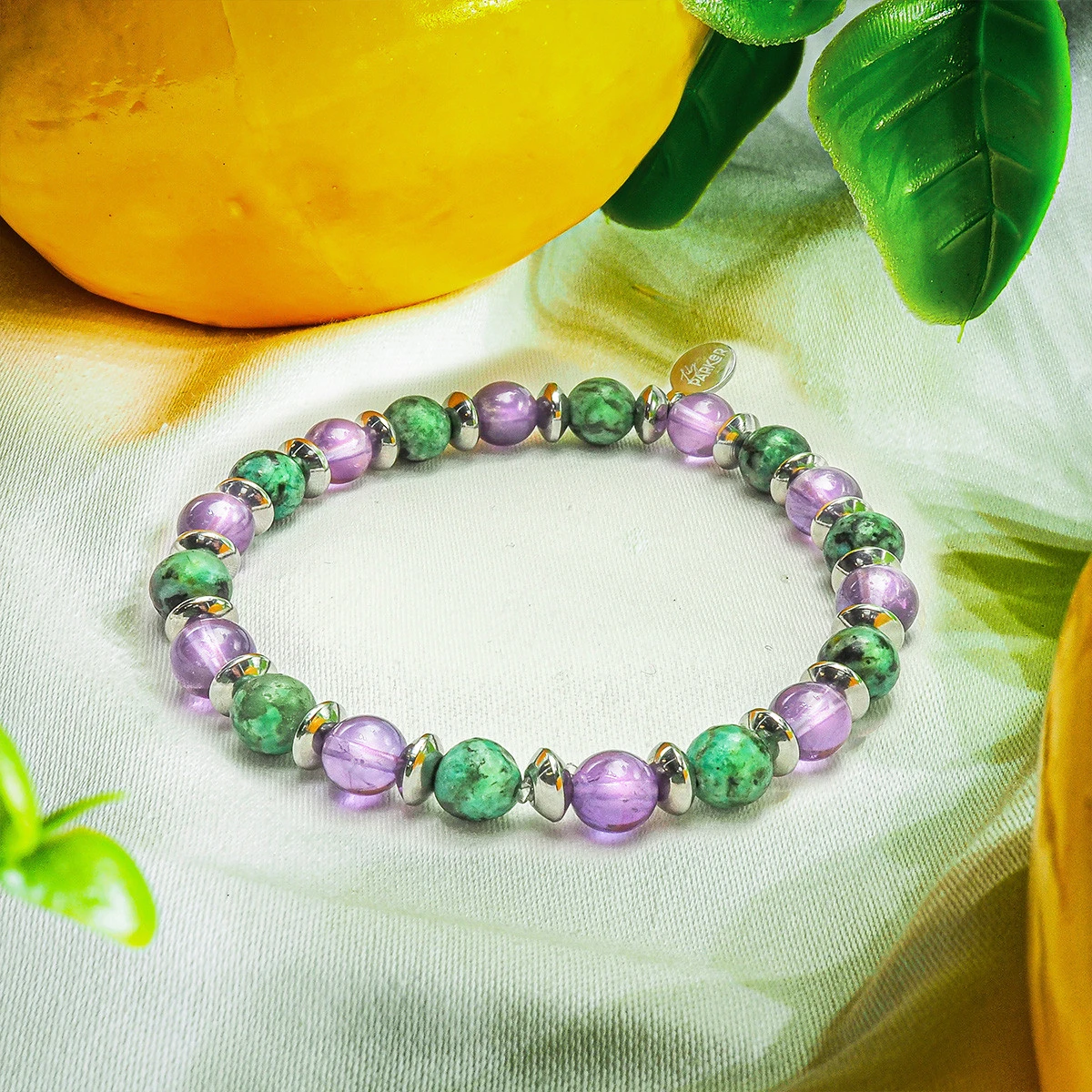 - Le bracelet Relax Max combine l’améthyste, connue pour ses effets apaisants, et la turquoise, réputée pour ses propriétés relaxantes. Assemblé en France, ce bijou pourrait devenir votre allié contre le stress. Portez-le pour trouver le calme intérieur et transformer les moments de tension en instants de sérénité. Laissez ses pierres naturelles vous accompagner vers une vie plus détendue et harmonieuse.
